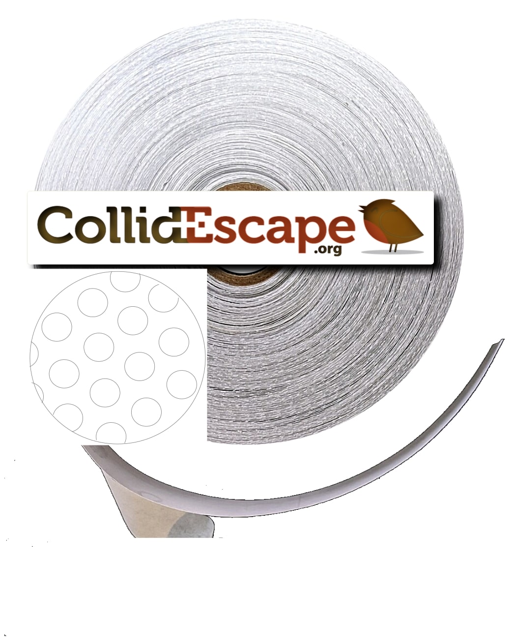 CollidEscape High Performance™ – Patterns adhere to the exterior glass surface of a window to alert birds to the surface. Patterns consist of ¾ ” CollidEscape™ Clear dots with 2″ spacing on a full 1″ wide stabilized recyclable liner and pre-spacing tape. Or ½” CollidEscape White dots with 2″ spacing on a 1″ wide stabilized recyclable liner and pre-spacing tape. While not guaranteed to eliminate strikes, independent monitoring and research by ornithologists have determined that Patterns, be they clear or white, when applied every 2″ x 4″ will reduce bird strikes by around 50%, applying every 3″ vertically will result in about a 75% reduction, and applying 2″ apart can approach nearly 90% collision reduction